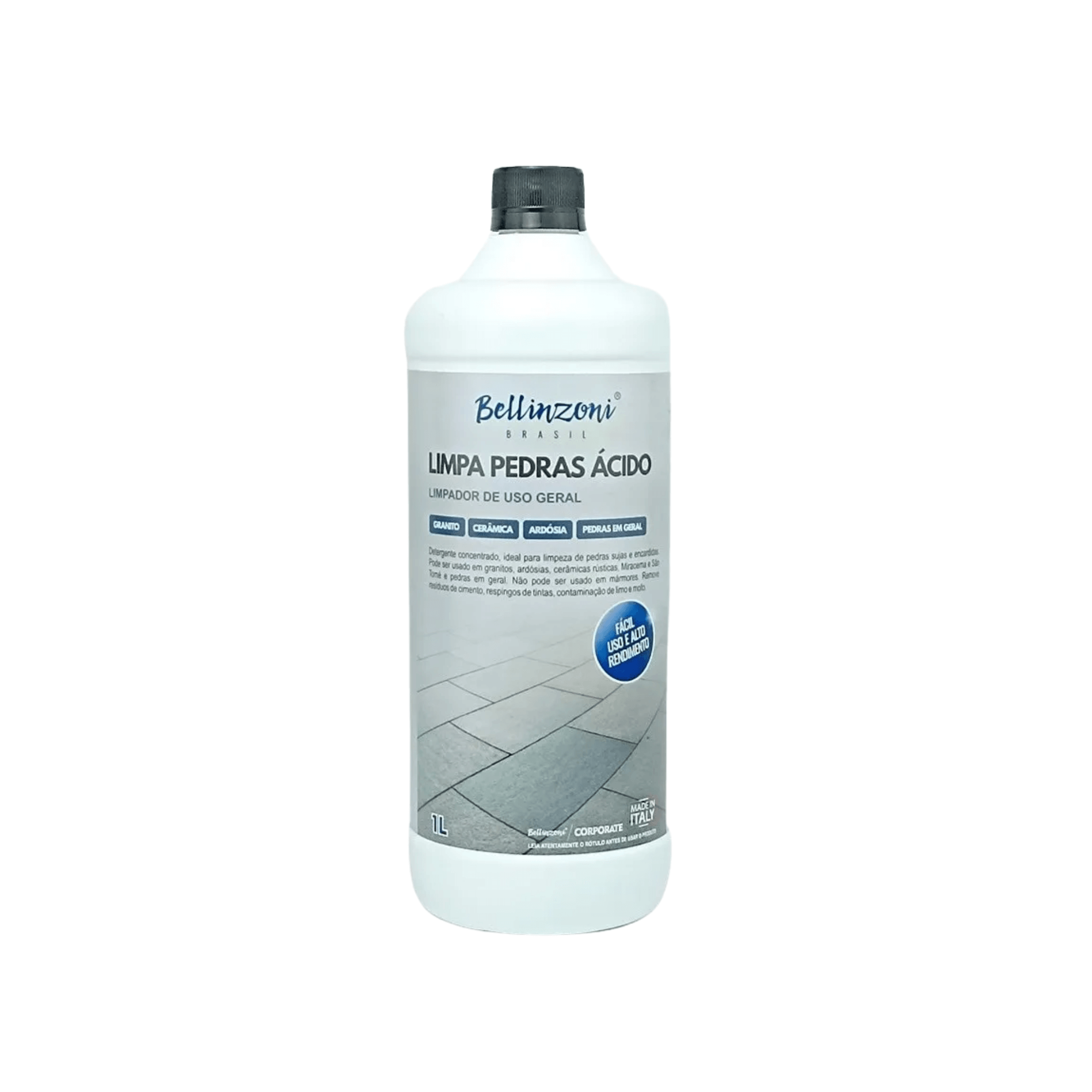 O Limpa Pedras Ácido 1L Bellinzoni é um detergente concentrado, ideal para limpeza de pedras sujas e encardidas. Pode ser usado em granitos, ardósias, cerâmicas rústicas, Miracema e São Tomé e pedras em geral. Não pode ser usado em mármores. Remove resíduos de cimento, respingos de tintas, contaminação de limo e mofo.