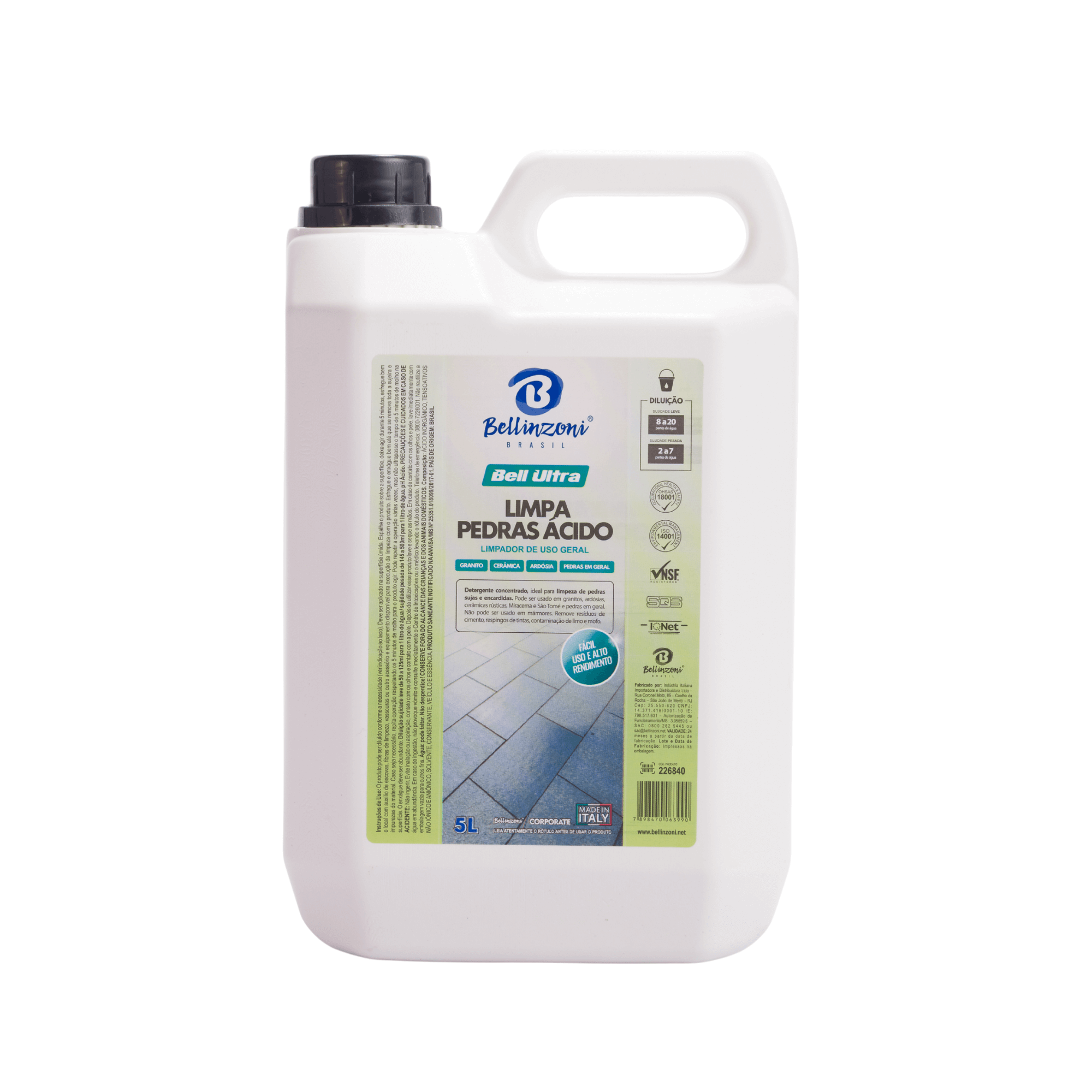 O Limpa Pedras Ácido 1L Bellinzoni é um detergente concentrado, ideal para limpeza de pedras sujas e encardidas. Pode ser usado em granitos, ardósias, cerâmicas rústicas, Miracema e São Tomé e pedras em geral. Não pode ser usado em mármores. Remove resíduos de cimento, respingos de tintas, contaminação de limo e mofo.